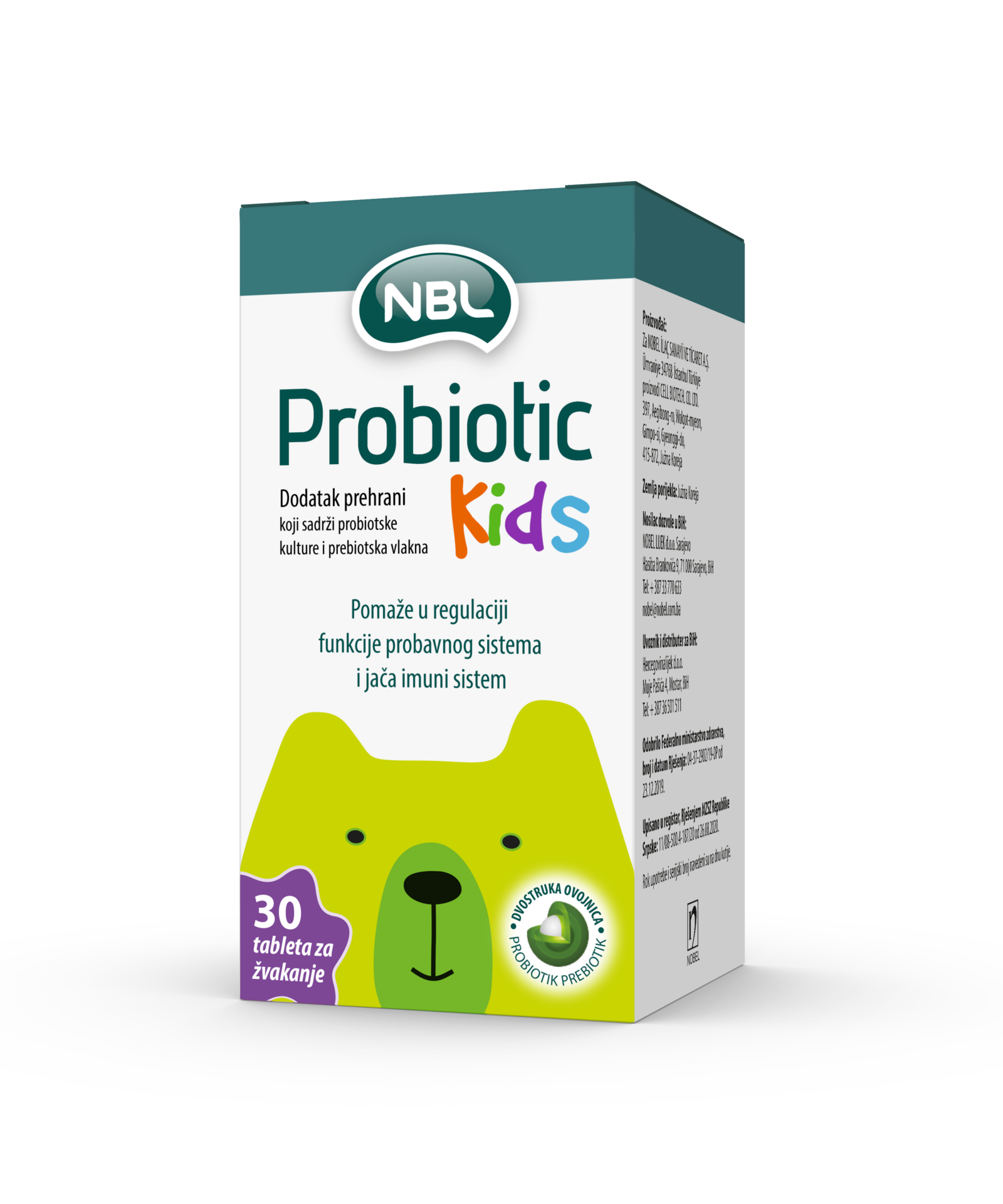 NBL Probiotic Kids su tablete za žvakanje u obliku medvjedića. Jedno pakovanje sadrži 30 komada, a koristi se jedna tableta dnevno, kod djece koja već znaju svjesno da žvaću hranu.
